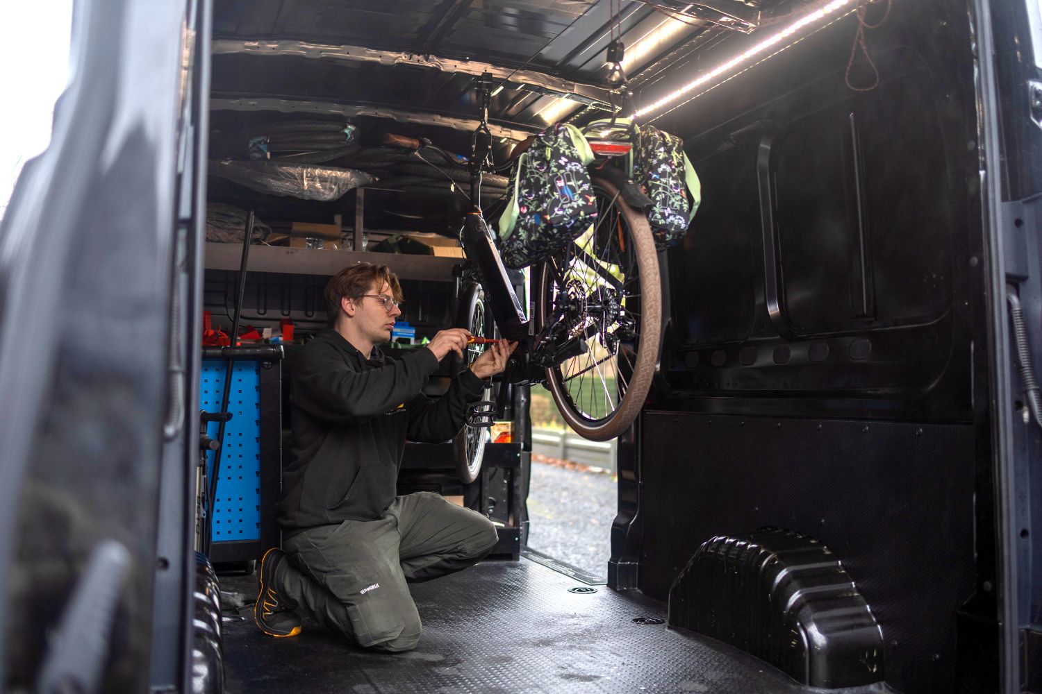 Of je nu thuis bent of op je werk: onze mobiele werkplaats stopt voor je deur. Je hoeft je kapotte fiets nergens heen te sleuren.